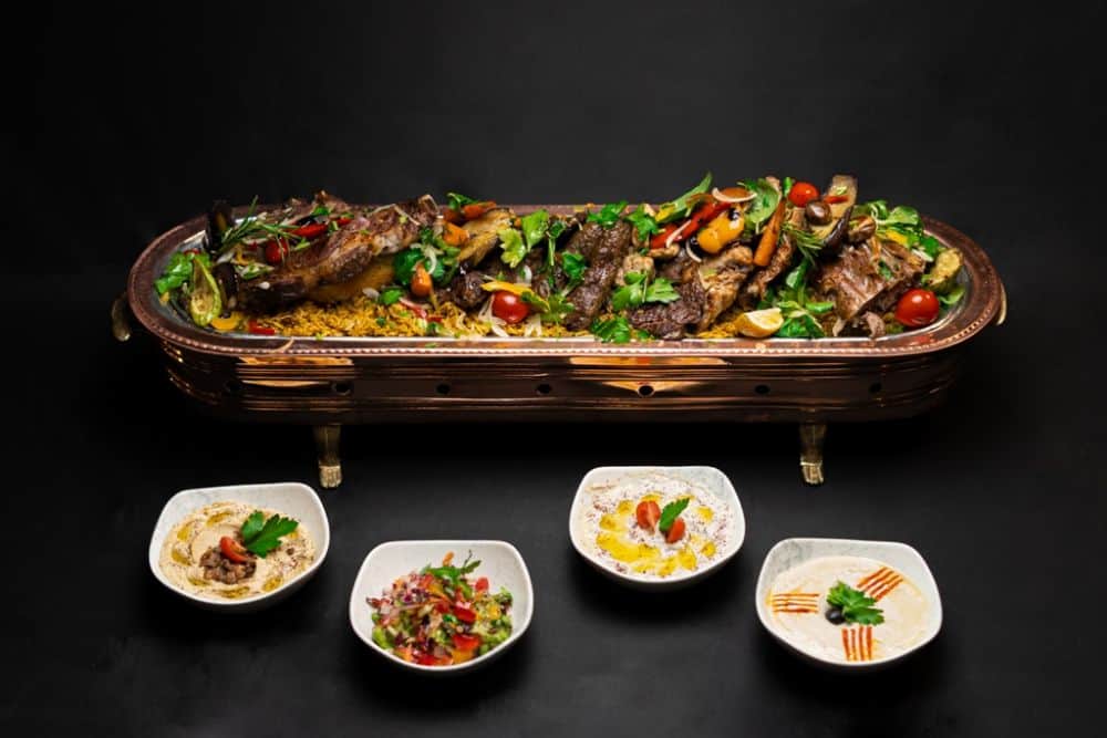 Roast lamb 300gr, rice/biryani, spices, shata sauce, pastry