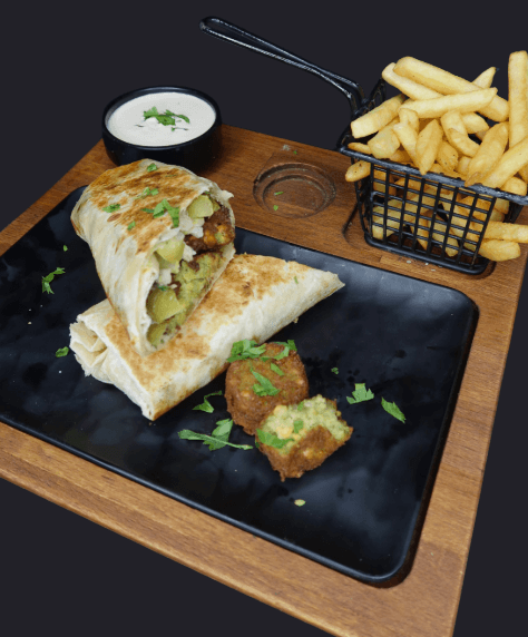 Tortilla, fried chicken, vegetables, Del Gusto sauce, french fries