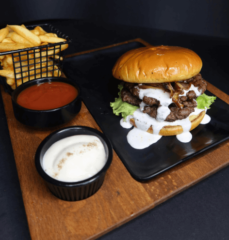 Bun, minced meat, cheddar cheese, dried meat, pickles, burger sauce, french fries