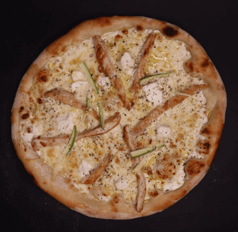 Pizza sauce, edam, gorgonzola, smoked cheese, mozzarella, red sauce, zucchini