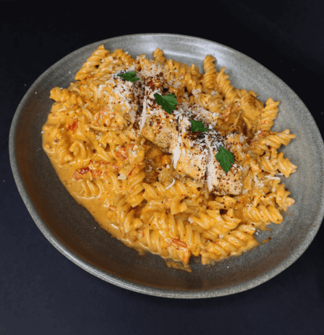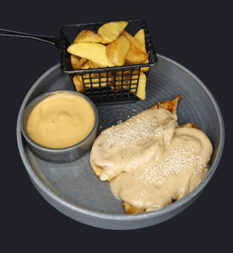 Chicken fillet 200g, cooking cream, gorgonzola, spices, pastry, side dish of choice