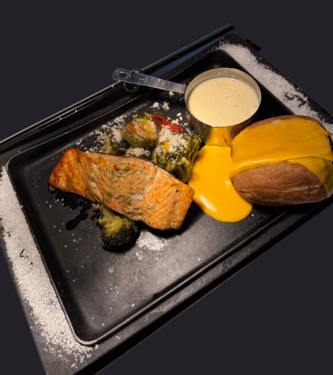 Salmon 250g, potato and spinach cream, royal vegetables, pastry, sauce