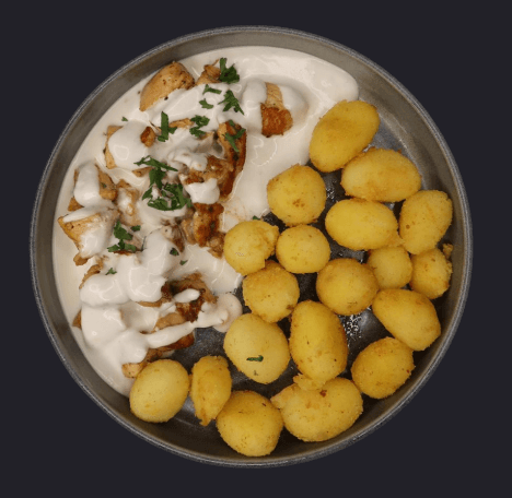 Chicken ½, rice/biryani, spices, shata sauce, pastry