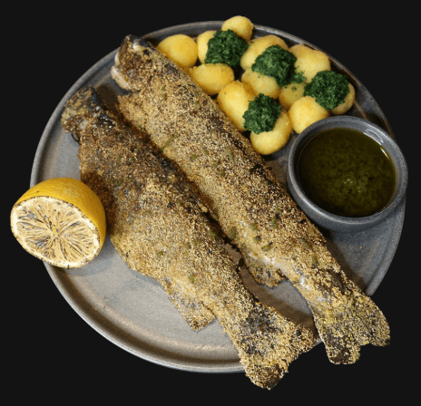 Chicken fillet, baked potatoes, gorgonzola sauce, pesto genovese, vegetables, pastry