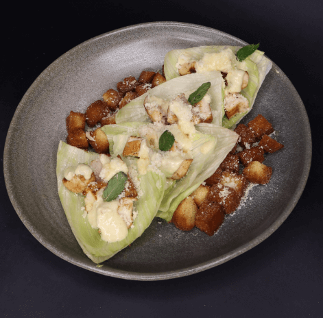 Chicken 120gr, sour cream, mayonnaise, iceberg, cucumber, cherry tomatoes, corn, arugula, parmesan, lemon
