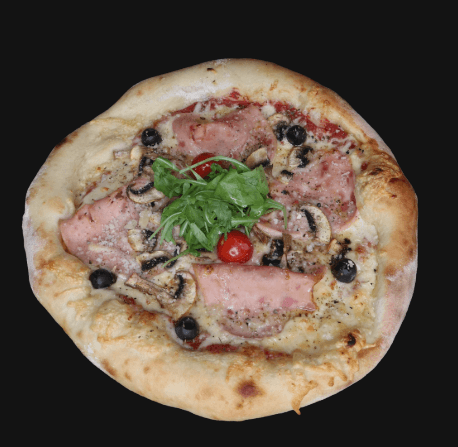 Tomato sauce, turkey ham, edam cheese, mushrooms