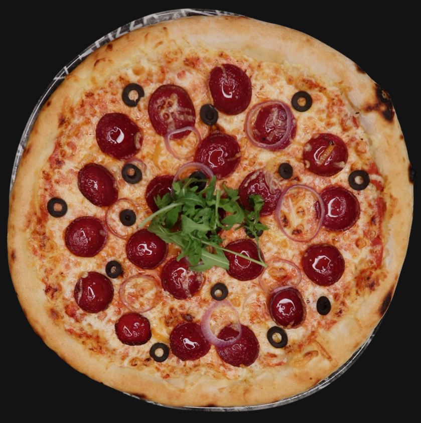 Spicy pizza with tomato sauce, mozzarella, red onion, sausage, black olive and hot chili peppers, seasoned to taste.