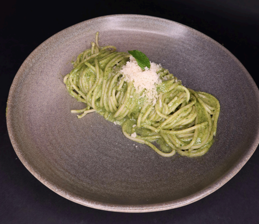 Spaghetti in a flavorful pesto sauce.