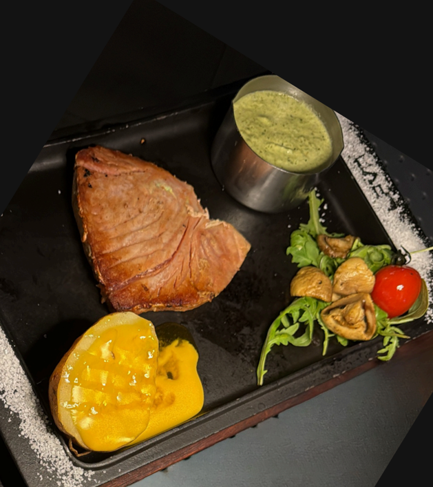 Juicy tuna steak, perfectly cooked and served with sides of your choice.